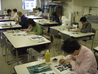いよいよ作品展へ向けての筆耕。お手本を見る姿もいつもより真剣でした。掲示しためくりのお手本で具体的な仕上りを感じて貰いました。7月期から参加された方々もめくり≠ノ挑戦していただきます。とにかく寄席文字を書いてみましょう。次回は皆さんに作品めくり≠書き上げてきていただきます。 |